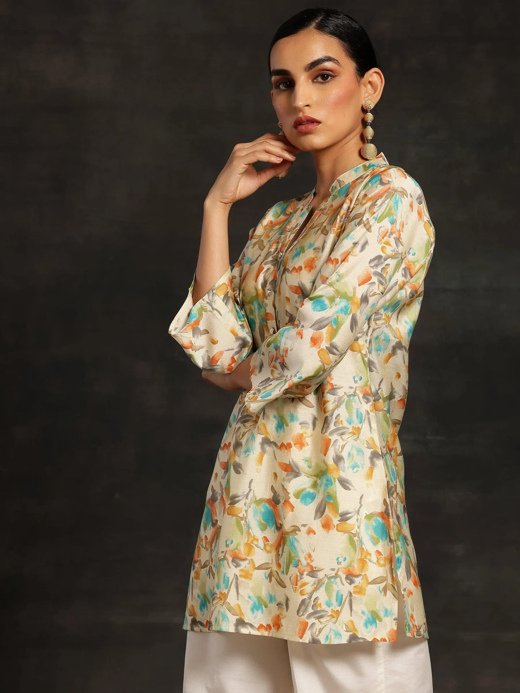 Beige Printed Silk Blend Straight Kurtis